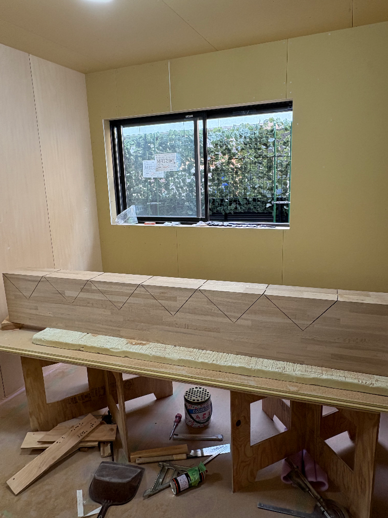 完成後に全体を眺めると、空間に広がりを与えてくれるデザイン性と、オークならではの存在感がうまく調和していると感じます。お客様にもとても喜んでいただけて、やりがいのある仕事になりました。